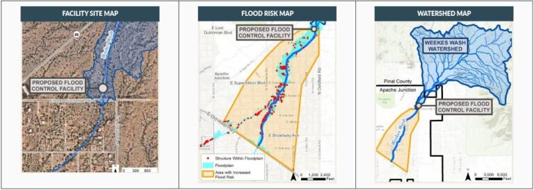 The Weekes Wash Multi-Use Detention Facility received an infusion of federal funds last week as part of an announcement. A total of $49M will be invested in Arizona flood control projects from the bipartisan infrastructure law led by Senator Kyrsten Sinema and shaped by Senator Mark Kelly, $44.43M of that is being directed to the City of Apache Junction and Pinal County Flood Control District for this project.