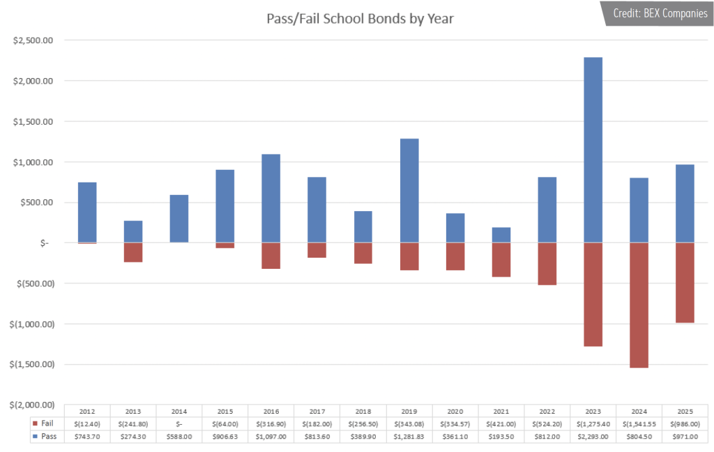 This year, 16 questions totaling $1.957B were on the ballot for K12 bonds. Of the total, $971M, or 49.62%, was approved, while $986M, or 50.38%, was voted down.