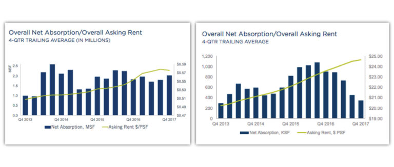 “Q4 2017 showed positive absorption, boosted by the strength of Class B (+447KSF) and Class C (+161KSF) absorption and dragged down by Class A (-225KSF) negative absorption,” the report states. “For the year, 2017 had positive absorption across all three classes. Class A space absorbed 324KSF, Class B space absorbed 848KSF and Class C absorbed 207KSF for a total of 1.379MSF positive absorption.”