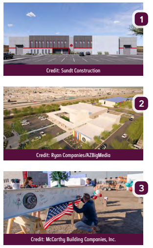 3. The Agua Fria High School District, with McCarthy Building Companies and ADM Group, celebrated the topping out of Hilltop School for the Arts and Theater. The milestone was marked with a beam signing ceremony followed by the placement of the final structural beam on the 115.1KSF, commemorating the project’s progress. The project, located in Litchfield Park at Litchfield and Camelback roads, includes the building of a 34KSF performing arts center as well as a two-story back-of-house area. Additionally, the project includes the construction of two single-level high-tech classroom buildings, a two-story building with a black box, media center, cafeteria, administrative offices and additional classrooms.
