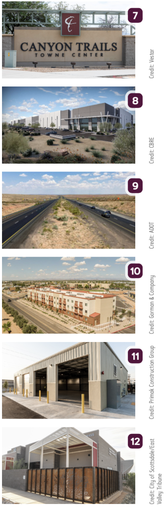 7. Canyon Trails Towne Center, a 90-acre mixed-use destination at the NEC of Cotton Lane and Yuma Road in Goodyear, has added 63KSF of new space, bringing the center to 492.3KSF. Owned by Santa Cruz Seaside Company, redeveloped by Scottsdale Development Partners and managed by Vestar, the project includes a recently completed 284-unit multifamily community by Embrey Partners. City-approved plans also allow construction of a 15KSF multi-tenant building, and the team is in discussions to add a limited-service or extended-stay hotel.