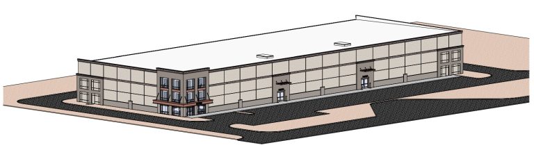 The plan includes an 800SF office and would provide a total of 14 parking spaces in front of the building. The rear of the building would be served by a drive aisle primarily for fire department and emergency services access.