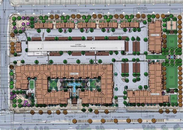 According to the submitted project narrative, “Bella Storia Apartments will consist of 367 residential units divided among four primary residential buildings along the south, east, and west sides of the Property and a series of townhome clusters along Haskell Street on the north side of the Property. Consistent with the design intent of the Bella Storia PAD, the buildings along Williams Field Road maintain close proximity to the arterial street to provide a more urbanized feel – but with shorter building planes and a mix of 3- and 4-story buildings to provide greater visual interest, allow greater visual permeability into the site, and create opportunities for enhanced amenities.”