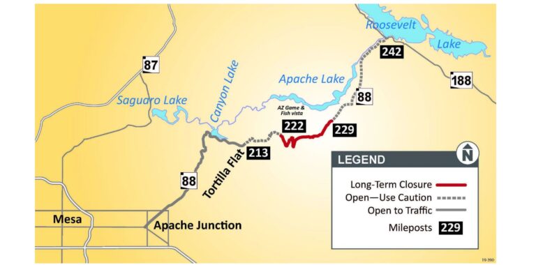 The Arizona Department of Transportation recently held an open house to gain public input about options to fix the closed stretch of State Route 88 (Apache Trail). Due to extensive roadway damage and rock debris following severe flooding in 2019, a 5-mile, unpaved section of State Route 88 (Apache Trail) from the Fish Creek Hill Overlook/Rest Area (milepost 222) to milepost 227 near Reavis Trailhead Road remains closed. The problem began with the Woodbury Fire in June 2019, followed by heavy monsoon rains.