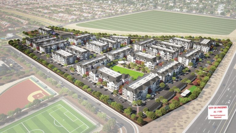 According to the staff report prepared for Phoenix’s Laveen Village Planning Committee, as well as supporting documents, the multifamily component would have a density of 24.28 units/acre with a lot coverage of slightly less than 24%. Building heights would be three stories/40 feet for the first 150 feet, with an increase of one foot for every five feet up to four stories/48 feet.