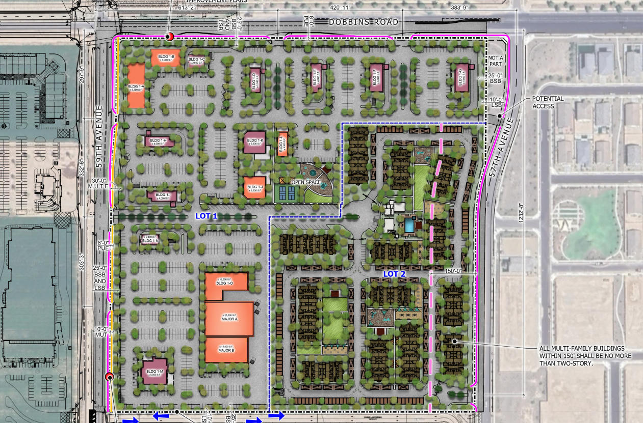 According to the submitted project overview, “The Site consists of approximately 38.96 gross acres (35.95 net acres) located at the southeast corner of 59th Avenue and Dobbins Road. The proposed development includes a town center and retail plaza area (hereafter ‘Lot 1’) on the northern and western portions of the Site and is intended for commercial use. The remaining portion of the Site includes a multi-family residential community (hereafter ‘Lot 2’) consisting of three hundred sixty (360) dwelling units with a density of approximately 24.83 dwelling units per acre (du/ac).