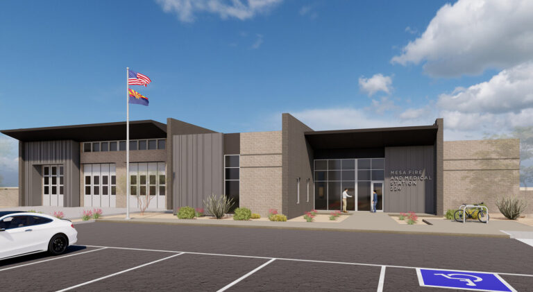 The station’s exterior style is based on Mesa’s existing Fire Station 221. The 13.1KSF, single-story building will feature four apparatus bays, a 10-space dorm, bathrooms, a kitchen and dining area, office space, equipment storage areas, a turn-out room, a decontamination room, a conditioning room and general support areas. There will also be covered entries and a patio area.
