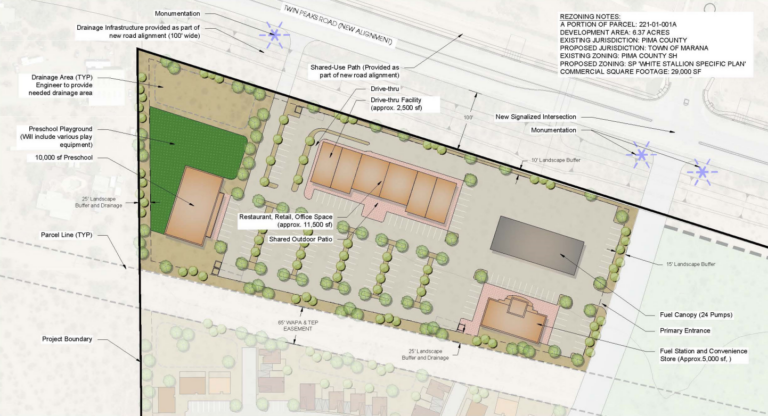 The proposal would require three concurrent actions from the Town to proceed: Annexation of the 218-acre site, a minor general plan amendment to Master Plan Area, and rezoning to the Specific Plan Zone. The White Stallion Specific Plan would take 218 acres from the True’s White Stallion Ranch – a resort guest ranch (also known as a “dude ranch”) on West Twin Peaks Road in unincorporated Pima County.
