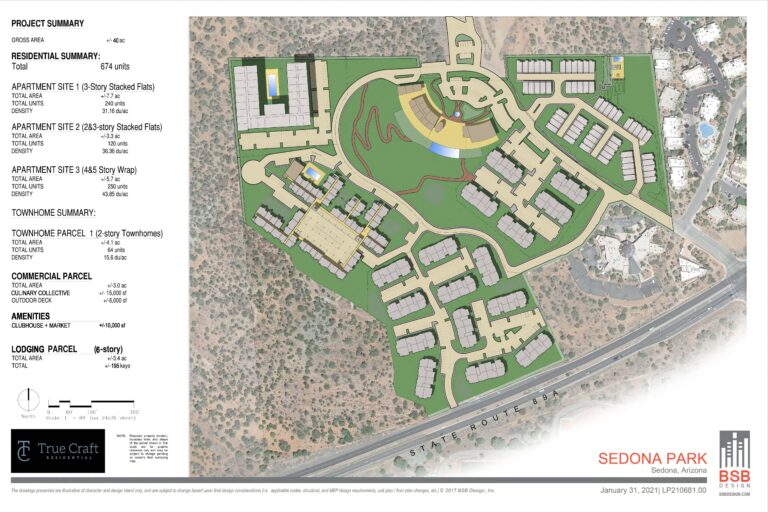 According to the Sedona Park project application submitted to the City’s Community Development Department, True Craft is requesting, “(A) zone change, minor community plan amendment, and development review for a mixed-use multi-family residential, commercial, and lodging development on approximately 40.8 acres located northwest of the intersection of SR-89A and Cultural Park Place.”