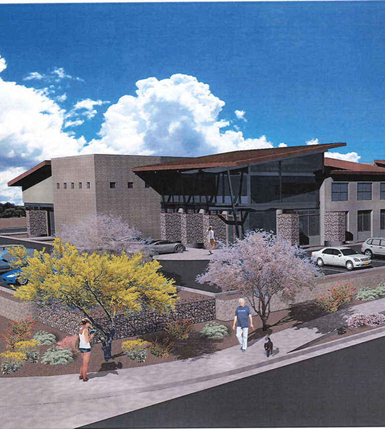 According to city documents, the project’s design features natural materials. The development is designed in muted colors to blend with the surrounding desert landscape. The buildings’ walls will be made from sand blasted, scored and stained concrete masonry units. There will also be exposed steel structural beams and columns designed to “maintain their ‘mill finish’ and be left to weather naturally.” The buildings’ office windows will face the McDowell Mountains, providing sweeping views for the workers. The developer plans to keep the native desert landscaping around the development, replanting native trees that may get displaced during construction.