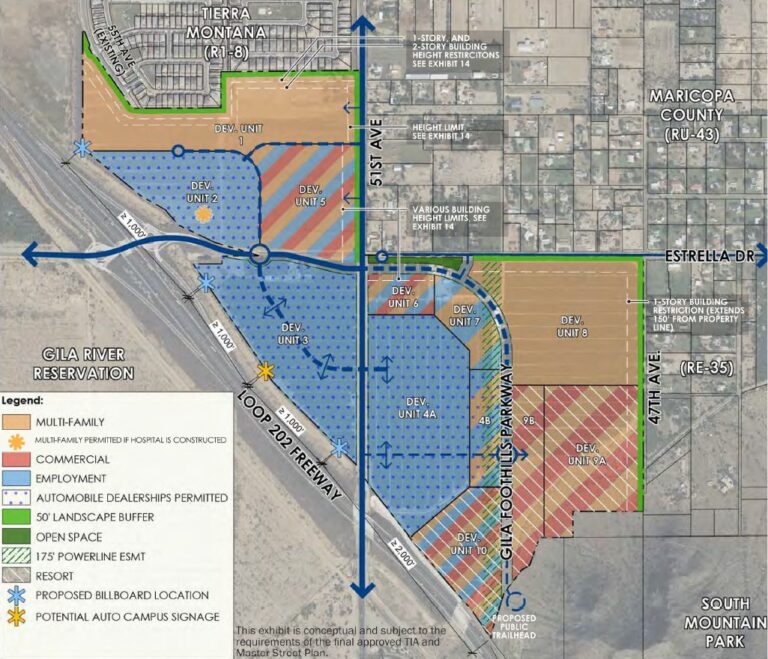 Planned uses for the site near Estrella Drive and 51st Avenue include an auto mall, a hospital with a Level 1 trauma center, single- and multifamily housing, and other supporting uses.