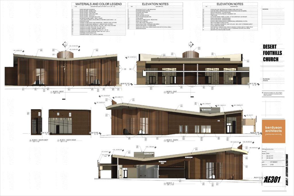 The 15.24-acre site on North Scottsdale Road south of Dixileta Drive currently has slightly more than 21KSF of sanctuary, classroom and office space. The planned third phase will restructure parking on site (removing 47 parking spaces in one area and adding 163 in another) and add several new buildings and features.