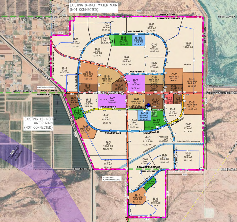 The Mixed-Use zoning areas combine for 89 acres and have 671 residential units planned. There will be two parcels zoned Mixed-Use at the northeast and southwest corners of Arizona Farms and Cooper roads.