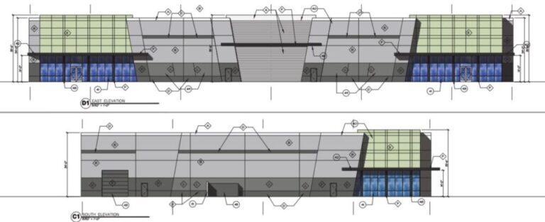 The buildings’ design allows for the entrances to face the street, with large shade canopies to be included for pedestrians and to provide shade near the office windows and doors. Areas for outdoor patio seating with shade are also being included in the development. The buildings’ design also includes metal canopies, steel, glass and tilt panels.