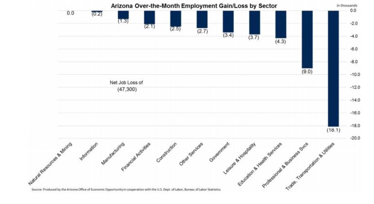 The state had a net loss of 47,300 non-farm jobs over the month, which is less than the historical 10-year (2010-2019) average loss of 51,000 jobs. Trade, Transportation & Utilities had the largest net loss of jobs with 18,100, followed by Professional & Business Services with 9,000. Of the 11 sectors tracked, Natural Resources & Mining was the only sector with no jobs lost for the month.