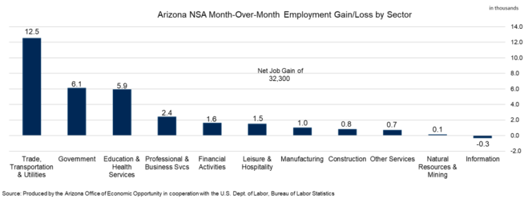 All 11 sectors tracked posted year-over-year gains. Education and Health Services led with 32,700, followed by Leisure & Hospitality with 21,400. Financial Activities showed the smallest year-over-year gains, adding jobs.