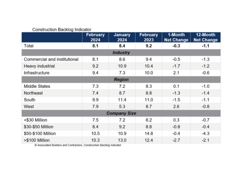Associated Builders and Contractors reported its Construction Backlog Indicator declined to 8.1 months in February, according to an ABC member survey conducted Feb. 20 to March 5. The reading is down 1.1 months from February 2023.