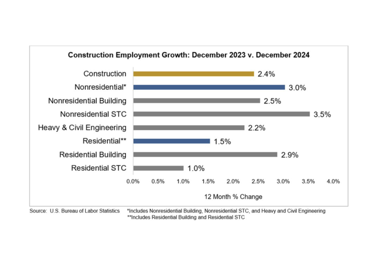 “Construction job growth, on the other hand, has clearly slowed in recent months,” said Basu. “The 15,000 jobs added during the fourth quarter of 2024 represent the fewest over any three-month period since the middle of 2021. While industrywide job growth is still significantly faster than economywide hiring over the past year, the interest rate implications of these data represent a greater concern for contractors. Bond yields surged even higher as a result of this jobs report, suggesting that the Federal Reserve may not cut interest rates during the first half of 2025. Contractors intend to increase their staffing levels in the coming months, according to ABC’s Construction Confidence Index, and it will be interesting to see if those intentions remain intact in early 2025.” (Source)