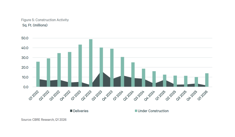 Deliveries fell to their lowest point since Q1 2019, ending the quarter at only 1.4MSF. Vacancy, however, only fell 80 basis points QoQ, marking a notable reversal to the supply spike of 2025.