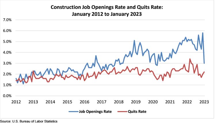 “Today’s construction job openings number was simply shocking,” said ABC Chief Economist Anirban Basu. “While the total number of job openings economywide stood at a lofty 10.8 million at the end of January, meaning that there are still nearly two job openings for every unemployed American, the number of construction job openings plummeted from 488,000 in December to 248,000 just one month later, according to the JOLTS report. In other words, almost one-half of all construction job openings disappeared in a single month.