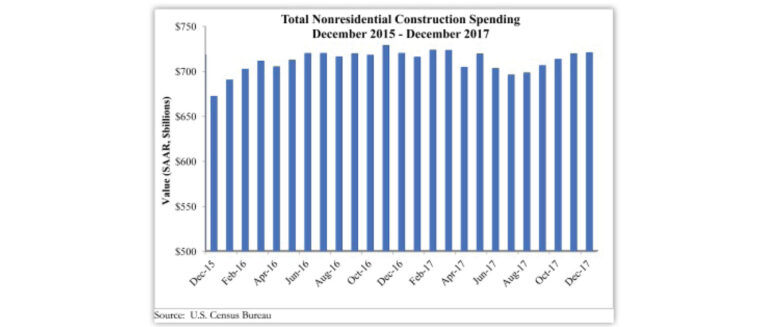 Nonresidential construction spending expanded 0.8 percent in December, totaling $720.4B on a seasonally adjusted basis, according to Associated Builders and Contractors’ analysis of data released by the U.S. Census Bureau. This represents the fifth consecutive month during which the pace of nonresidential spending has increased.