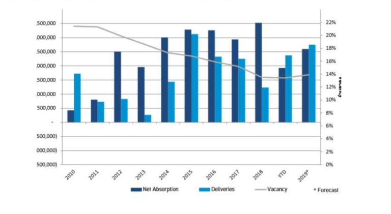 Third quarter 2019 was the second strongest quarter for absorption since 2015. Nearly 1MSF of net absorption occurred during the third quarter, bringing the year-to-date total of net absorption to 1.9M. This marks the 30th consecutive quarter of positive net absorption. Colliers predicts this pace will result in approximately 2.6MSF of net absorption for 2019. Despite below levels posted in recent past years, this amount of absorption will maintain a robust market.